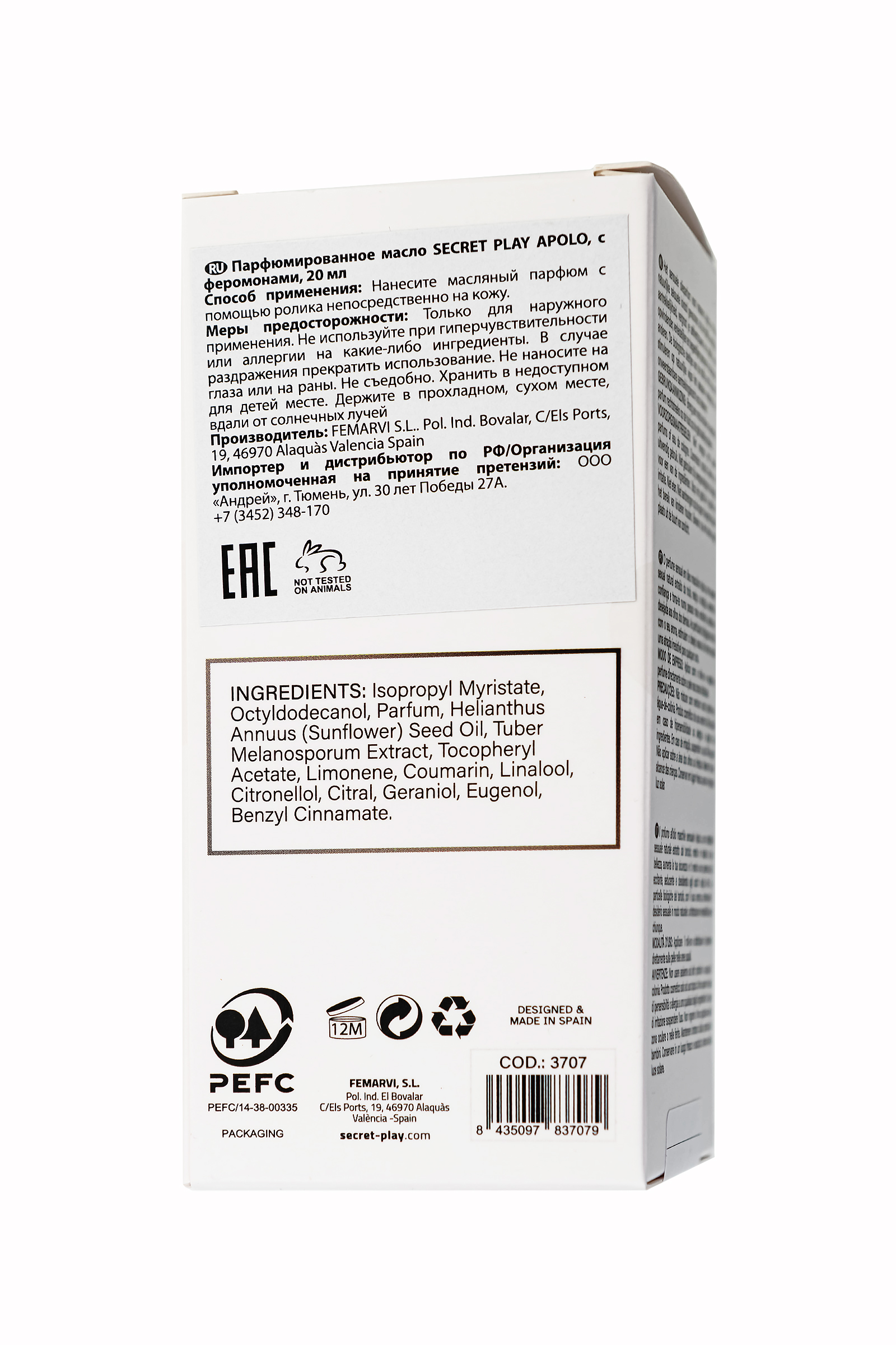 Парфюмированное масло Apolo от Secret Play — это мощное олицетворение мужской привлекательности и уверенности. Этот аромат, насыщенный естественным очарованием трюфеля, раскрывает ваше сексуальное притяжение и превращает вас в объект внимания, о котором невозможно забыть. Трюфель — один из самых сильных природных афродизиаков, и его биологические компоненты в составе аромата стимулируют сексуальное желание естественным образом, создавая непреодолимую ауру соблазна вокруг вас. Сочетание глубоких древесных нот придает парфюму чувственность и стойкость, которая остается с вами на протяжении всего дня. Нанесите масло Apolo с помощью шарикового флакона на пульсирующие точки — запястья, шею или за ушами — для максимального раскрытия аромата и продолжительного эффекта. Масляная текстура парфюма обеспечивает мягкое и равномерное распределение, позволяя аромату раскрыться постепенно и сохраняться на коже в течение всего дня. Флакон с шариковым дозатором — это удобный способ нанесения, позволяющий точно контролировать количество масла и обеспечивать равномерное распределение аромата. Благодаря компактному размеру (20 мл) Apolo легко взять с собой, чтобы ваш любимый аромат всегда был под рукой. Этот парфюм создан для мужчин, которые знают себе цену и готовы покорять сердца одним лишь присутствием. Apolo — это ваш верный спутник в мире соблазна и уверенности. Формат: шариковый флакон для удобного нанесения Объем: 20 мл Аромат: древесные ноты Продукт не тестируется на животных Масляная основа для продолжительного эффекта Компактный формат, удобный для использования в дороге Для мужчин Страна бренда: Испания Состав: изопропилмиристат, октилдодеканол, отдушка, семена Helianthus Annuus (подсолнечника). Масло, экстракт клубней Melanosporum, токоферилацетат, лимонен, кумарин, линалоол, цитронеллол, цитраль, гераниол, эвгенол, бензилциннамат. Меры предосторожности: Не смешивать с другими духами или одеколоном. Косметическое средство только для наружного применения. Не использовать при гиперчувствительности или аллергии на ингредиенты. В случае раздражения прекратить использование. Не наносить на область вокруг глаз или поврежденную кожу. Не глотать. Хранить в недоступном для детей месте. Держать в прохладном, сухом месте вдали от солнечного света.